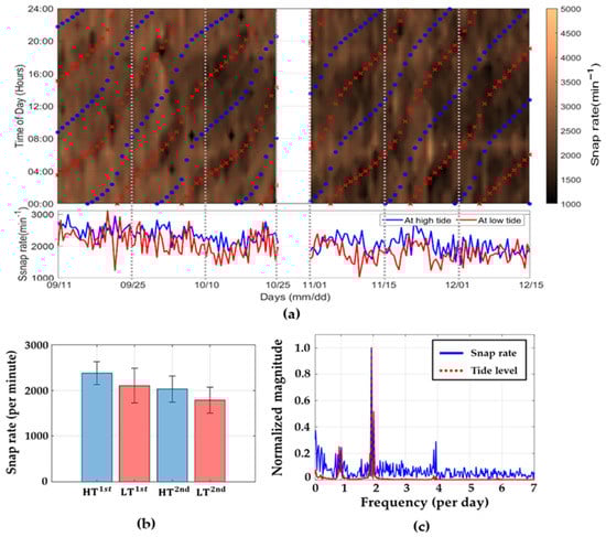 The snap rate pattern followed the tidal cycle and was higher at high tide and lower at low tide, as shown in Figure 5. The line plot of Figure 5a depicts the per-hour change in the snap rate for 90 days and the difference at low and high tides. The means and standard deviations of the snap rate at high tide were 2205 ± 320 and 1957 ± 372 in the first- and second-half periods, respectively, and those at low tides were 2100 ± 320 and 1800 ± 320 (Figure 5b). The mean snap rate was 13% higher at high tide (p < 0.001) than at low tide. As a result of period analysis using fast Fourier transforms, the solar and half-diurnal casting cycles were dominant. Tidal signals show strong semidiurnal and diurnal components with some other components, such as four and six times a day. Based on this, the snap rate explains that the diurnal component is dominant, followed by the semi-diurnal component among the components of the tidal cycle (Figure 5c).