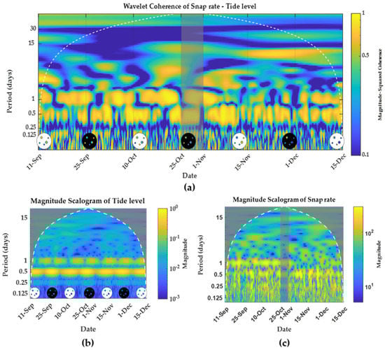 Wavelet transform analysis of snap and tide level. (○: Full moon, ●: New moon, ■: fill in the missing snap rate data); The wavelet analysis results in (a) coherence between snap rate and tidal level, (b) tidal level, and (c) snap rate.