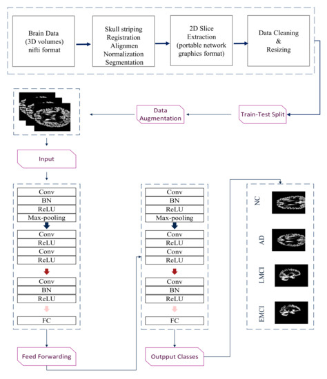In this section, we explain the framework of the practical multiclass classification network to classify various stages of Alzheimer’s disease based on the MRI data. A comprehensive pre-processing pipeline was designed to extract the 2D images from the 3D MRI volumes for the proposed network to detect AD at the earliest possible stage (pre-dementia). Because of the complexity of the pattern, it is difficult to discriminate between the patterns with quantitative analysis and even radiological scans at the early stages of AD. To detect changes in the biomarkers, the pre-processed data (i.e., 2D slices extracted from the MRI volumes) were fed to the network. The network learned to classify changes in the information to distinguish EMCI, LMCI, NC, and AD. The proposed learning-based framework limits the complexities of diagnosing and monitoring disease at an early stage.