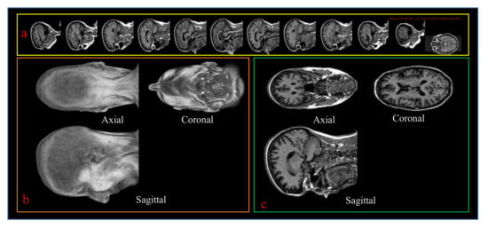 Overview of the capturing process. (a) The scans, (b) pre-processed 3D images of axial, sagittal, and coronal views, and (c) processed axial, sagittal, and coronal views.