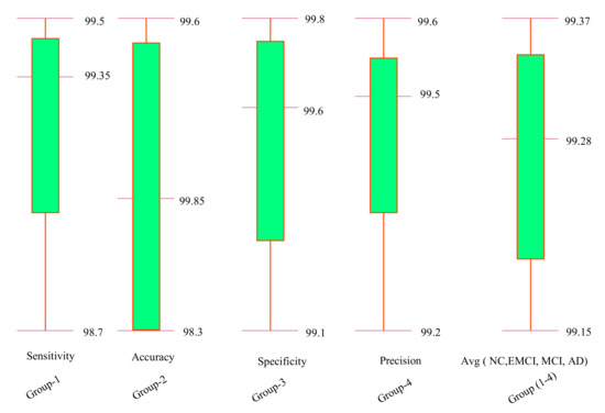 The graphical analysis of the performance of the proposed network. Box plots are shown for the sensitivity, accuracy, specificity and precision for all the four groups (i.e., Group 1–4); each group is comprised of 4 classes (i.e., NC, EMCI, LMCI, and AD). The average is also shown for all groups (i.e., Group 1–4).