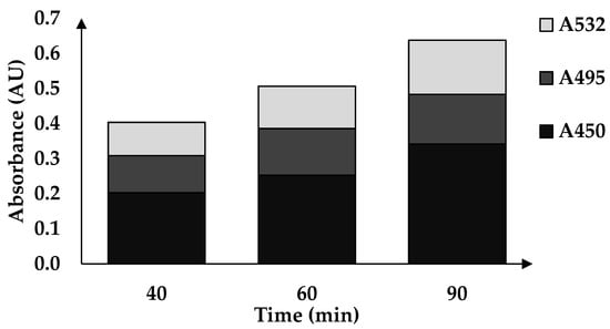In addition, the maximum absorption values for each studied wavelength were obtained by incubating samples for 90 min. In all situations the MDA concentrations were calculated, considering the absorbance values obtained at 532 nm (65.02 µg/L—40 min, 107.33 µg/L—60 min, and 144.00 µg/L—90 min) and the resultant data showed that the highest value, which was associated with a complete reaction between MDA and TBA, was obtained after 90 min of incubation. Thus, the optimal incubation time of 90 min was selected.