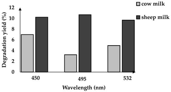 As shown in Table 5, the absorbance values obtained for sheep milk were higher than those obtained for cow milk. After 24 h of storage at room temperature, there was even higher degradation in the case of sheep milk compared to cow milk for each degradation parameter considered (absorption wavelengths considered—450, 495, and 532 nm), as shown in Figure 2.