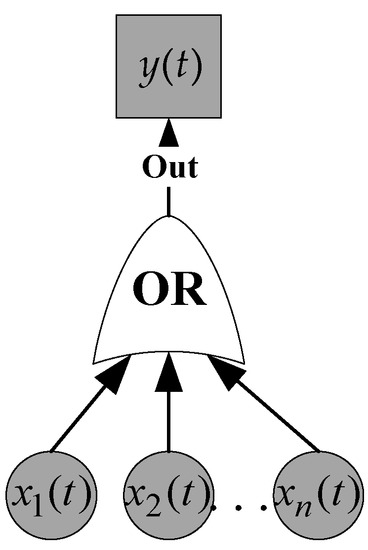 In the modeling of a repairable system, the reliability calculation formulae of the OR gate and the AND gate of a general repairable system are temporarily adopted [44]. represents the normal working probability of the OR gate input event at time t, is the failure state probability of the OR gate input event at time t, is the maintenance rate of the input event , and is the failure rate of the input event . represents the normal working probability of the OR gate output event at time t, is the failure state probability of the OR gate output event at time t, is the maintenance rate of the output event , and is the failure rate of the output event (Figure 1).