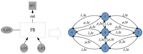 In the FB logic gate, the input event and output event have two states: state 0 is the normal working state, while state 1 is the fault state. According to the relationship between the input and output events and , a list of the quantitative operation rules of the FB gate can be obtained, as shown in Table 5.