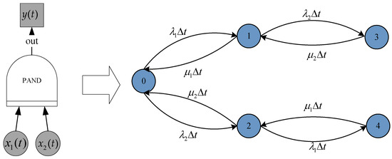 In Figure 5, represents the normal working probability of the PAND gate input event at time t, is the failure state probability of the PAND gate input event at time t, is the maintenance rate of the input event , and is the failure rate of the input event . represents the normal working probability of the PAND gate output event at time t, is the failure state probability of the PAND gate output event at time t, is the maintenance rate of the output event , and is the failure rate of the output event .