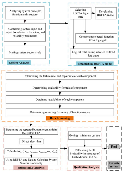 In the reliability analysis process of RDFTA, the quantitative and qualitative analysis results of the RDFTA are obtained. The existing RDFTA reliability analysis process is not suitable for considering the failure rate and maintenance correlation of repairable systems at the same time. Therefore, using the new RDFTA logic gate, a new RDFTA reliability analysis process framework for repairable systems was proposed, as shown in Figure 6.