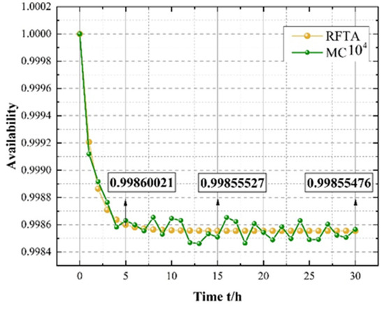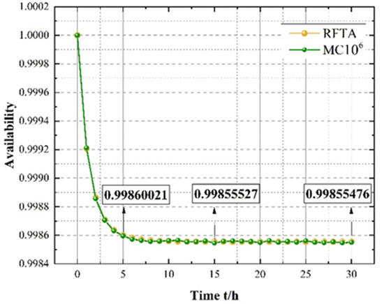 Figure 13 and Figure 14 show that the probability of the RDFTA and Monte Carlo calculation outputs was similar and that their reliability conclusions were basically the same. This showed that the reliability analysis method of RDFTA is feasible and correct. From the RDFTA minimum cut set algorithm (Equation (13)), the following could be established: K1 = {}; K2 = {}; K3 = {}; K4 = {}; K5 = {}; K6 = {}; K7 = {}; K8 = {}; K9 = {}; K10 = {,}; K11 = {,}; K12 = {,}; K13 = {,}; K14 = {,}; K15 = {,}; K16 = {,}; K17 = {,, }; K18 = {,,}; and K19 = {,,,}.