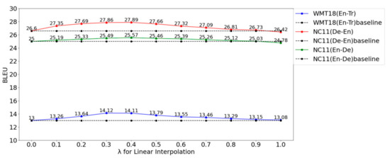 BLEU scores of the Linear Interpolation method on the WMT18 (EN-Tr), NC11 (En–De) and NC11 (De–En) test sets with different values of λ. The dashed line denotes the result of the baseline.