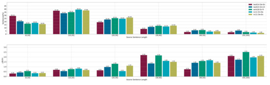 As shown in Figure 5, the FRA proposed in this paper is more useful when translating long sentences; it obtained more than +1.5 BLEU points when translating long sentences in all the experiments and achieved +2.51 BLEU points on the En–Tr pair, although, admittedly, only a few sentences (1.9% 3.2%) in the evaluation datasets were long. This phenomenon is consistent with our expectations. Generally speaking, the structure of long sentences is more complicated, and factual relation information can guide the model so that it pays more attention to the important clues about sentence relations between several entities, thereby improving performance.