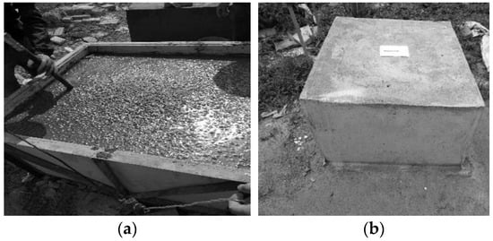 The model was concreted with Portland cement materials. The model aggregate adopts quartz sand with a particle size of 0.35 mm to 0.5 mm, proportioned with a mass ratio of cement, quartz sand, and water of 1:5:1. According to the third similarity theorem: “For the same type of physical phenomenon, if the single-valued quantities are similar, and the similarity criteria constituted by the single-valued quantities are equal in numerical value, the phenomena are similar”, the geometry and boundary conditions both satisfy the single value condition in the blasting model test. It is necessary to meet the non-minimum burden and have a surface without cracks and damage regarding the size and boundary effects. According to experience, the requirements are satisfied when the blast hole’s distance to the non-minimum burden’s direction is greater than 1.5 times the minimum burden. The specific dimensions are: length 0.60 m, width 0.60 m, height 0.65 m, and blast hole diameter 10 mm. In addition, there are more than three models for each burden to ensure that there are enough data samples after excluding the apparent error data. The model is concreted at once to ensure that the mechanical properties of different model materials are consistent. After the model is made, it is wet-cured for 7 days. Then, it is cured in a natural environment for 28 days, with the test conducted after confirming that there are no cracks on the model’s surface, as shown in Figure 4.