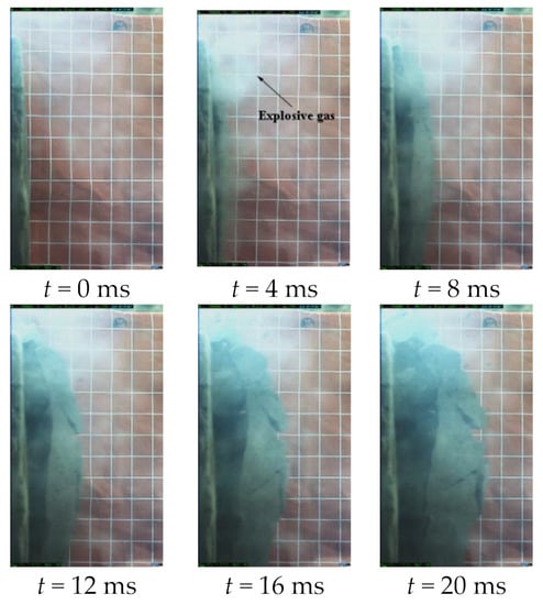 The rock bulge and throwing motion patterns at different time points after detonation were obtained for each of the five burden cases during the model test. Only the motion pattern of Model 1 is listed, and the minimum burden is 0.12 m every 4 ms, as shown in Figure 8.