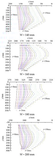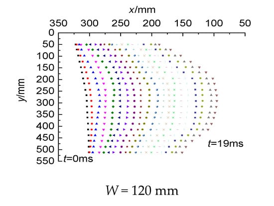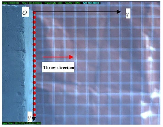 We utilized the previously built calculation method to obtain the initial casting velocity and throw kinetic energy. Then, we divided the broken rock into 20 micro-elements along the axial direction of the blast hole. We took the midpoint of each micro-element as the characteristic point. Finally, a relative coordinate system was constructed with the background grid as the size reference, as shown in Figure 9. At the same time, we used the tracking function of hotshot/cc processing software to track and capture the characteristic points of different models. Finally, on the basis of conducting five burden model experiments, the position and shape of the bulge movement of the free-face rock for every millisecond in the 0 ms to 19 ms period were obtained, as shown in Figure 10.