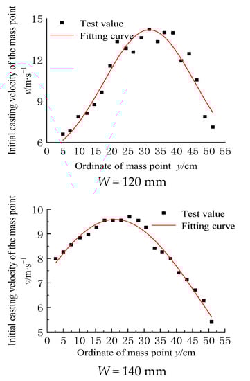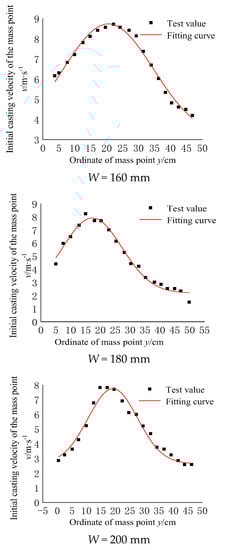 Figure 8 and Figure 10 show the real spatial motion law of blasting broken rock obtained from the high-speed photography. According to Equation (23), the space–time relations of the five burden-free surface broken rock masses at different moments are calculated. When the broken rock on the free surface reaches the initial casting velocity, the distribution law of the casting velocity of broken rock masses at different step heights is thus obtained. The experimental values of the mass velocity distribution are shown in Figure 11.