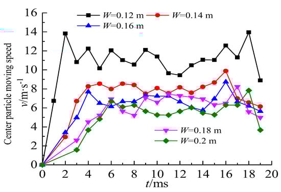 Where the maximum casting velocity occurs in five burdens, using the Equation (24), the relationship between the velocity of the particle and the time is obtained, as shown in Figure 12. Calculation results show the following.