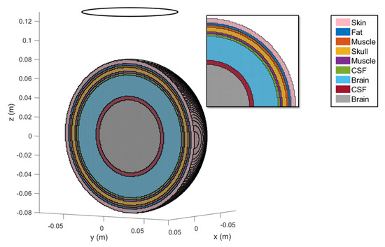 The first model used in this paper is a multilayered sphere. The advantage of this model is that it is possible to define an analytical solution taken as reference to compare the numerical results. Figure 3 shows the voxel-based mesh and the tissue type assigned to each layer. Table 1 reports the details about the geometry and the tissue properties.