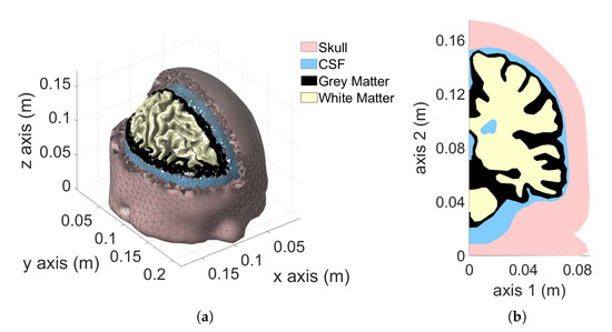 Voxel and tetrahedral discretizations are compared considering a more challenging model, the realistic human adult head Colin27 Average Brain (also known as Average Colin). Average Colin is an adult brain atlas [30] that consists of four tissues: skull, cerebrospinal fluid (CSF), gray matter (GM) and white matter (WM). This atlas was obtained by scanning the brain of Colin J. Holmes 27 times (hence the name Colin27) over the course of a few months. The images were combined to create an average brain with high structure definition. The tetrahedral mesh was created by Qianqian Fang (more information can be found in [31]) and it is freely available for download [32]. The model is shown in Figure 4a.