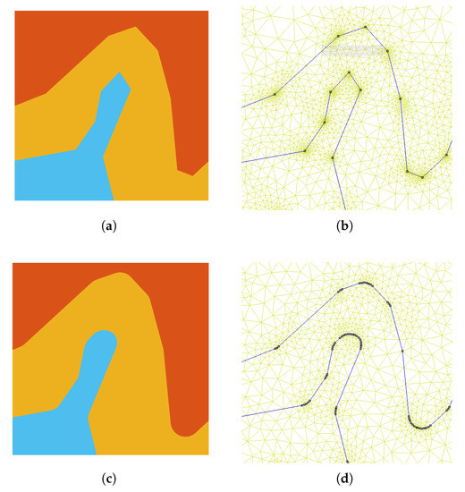 Manual control of the tetrahedral mesh: the boundaries were smoothed to avoid singularities. Tissue boundaries before local smooth edits (a) and the related mesh (b). Tissue boundaries after local smooth edits (c) and the related mesh (d).