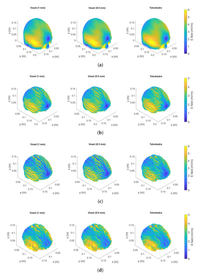Localized exposure (coil in front of the head model). The induced electric field in Colin27 Average Brain is shown for tetrahedral mesh and voxel-based meshes with resolution of e in each tissue: skull (a), CSF (b), grey matter (c) and white matter (d).