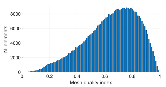 The factor 3 is used to normalize the value of q in the range . For a regular tetrahedron, q equals 1; therefore, a good-quality mesh should have most of tetrahedra with quality index close to 1.