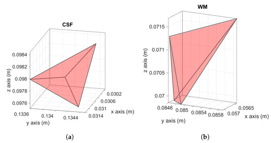 Tetrahedron with related to the maximum electric field in CSF (a). Tetrahedron with related to the maximum electric field in the white matter (b).