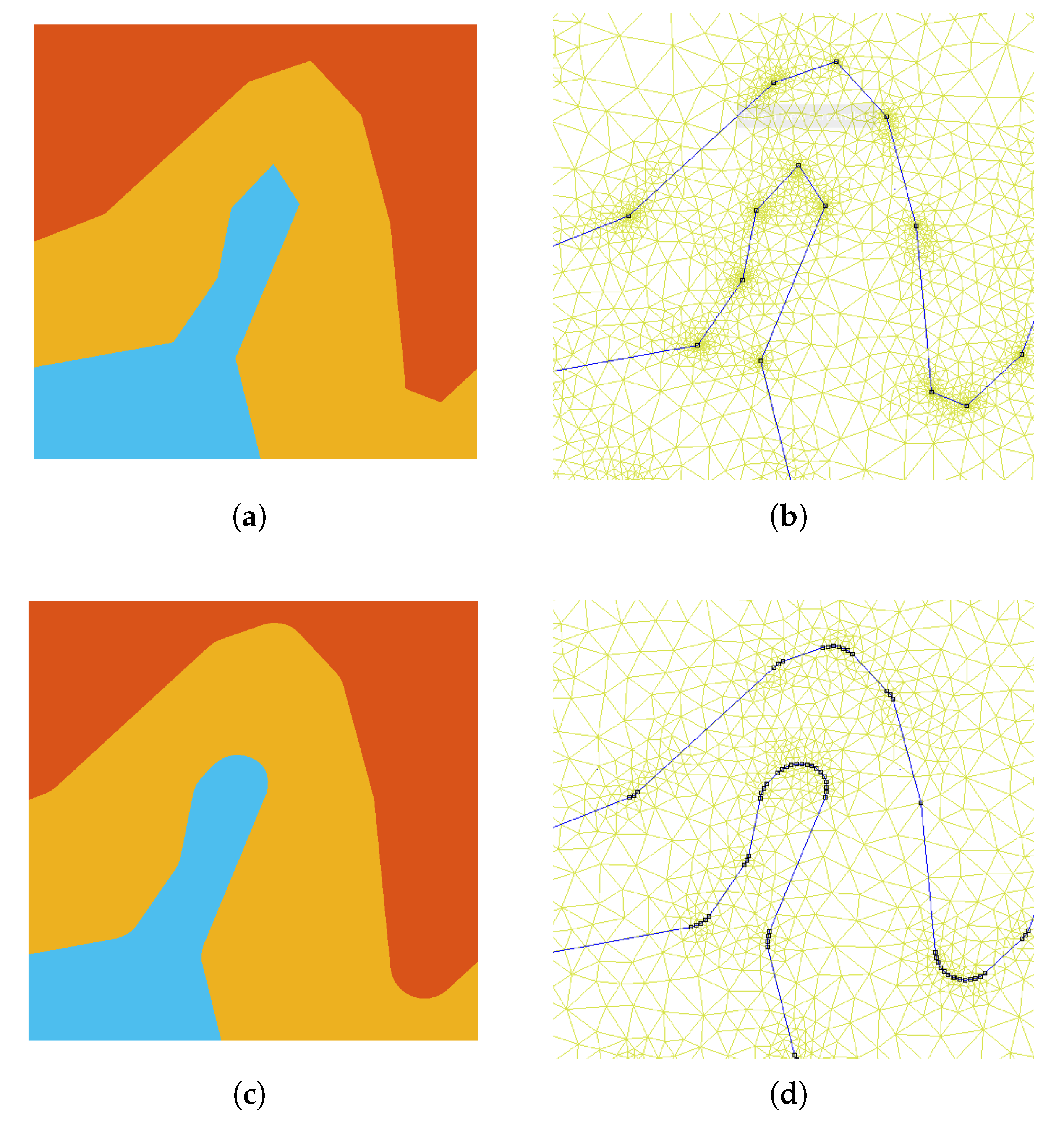 - Field, D.A. Qualitative measures for initial meshes. Int. J. Numer. Methods Eng. 2000, 47, 887–906. [Google Scholar] [CrossRef]