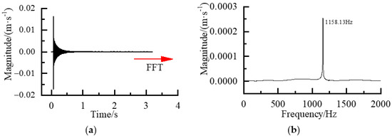 Typical test curve of short suspender measured by LDV (Sample 1 under tension force of 8.41 kN). (a) Vibration curve in time domain; (b) Vibration curve in frequency domain (the natural frequency is 1158.13 Hz).