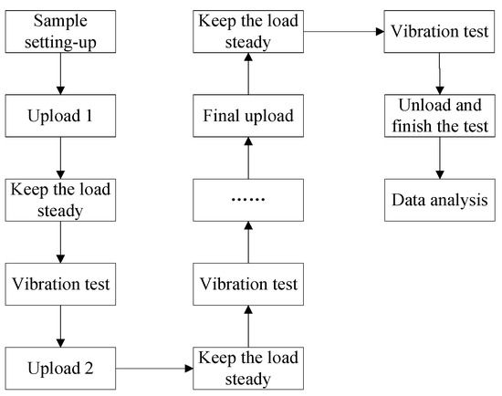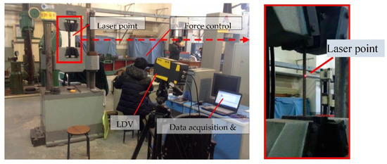 A universal testing machine of the type WEP-600, produced by Chang-chun Test Instrument Co., Ltd., Changchun, China, was used to preload and sustain the load on steel rebars until the design force and the tensioning construction simulation were completed. The maximum range of the machine is 600 kN and the accuracy is 0.01 kN. The vibration frequency of prestressed steel rebars was measured after the load shutdown for 1–2 min in order to reduce the influence of instrument vibration. Meanwhile, the maximum prestress was divided into ten levels for forcing, and the corresponding vibration frequency was collected in sequence. The test procedure and experiment operation site for testing vibration frequency of prestressed steel rebars by using LDV are shown in Figure 2 and Figure 3. That is to say, the tension force for steel rod-type short suspenders during experiments was controlled by a universal testing machine, and the detected results for tension force were obtained on the basis of theoretical calculation and vibration frequency.