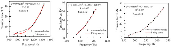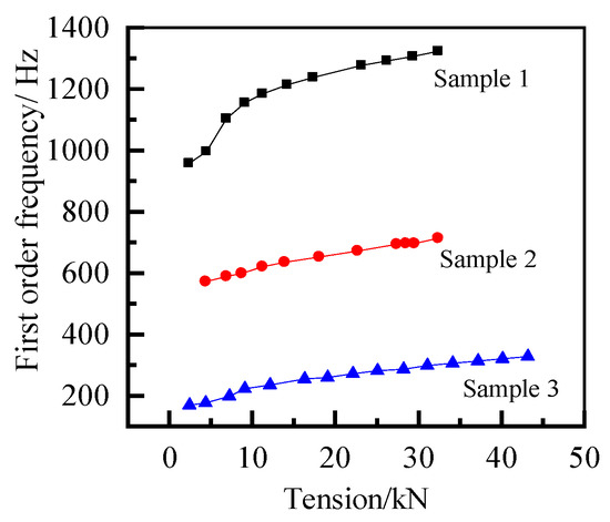 Figure 4 shows the relationships between tension force and vibration frequency for steel rod-type short suspenders of samples 1–3 with different lengths. It can be seen that the vibration frequency of specimens increases with the increase of tension force and decreases with the increase of suspender length.