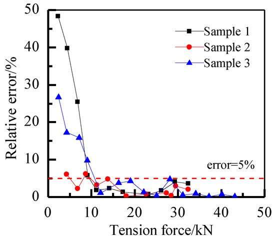 where is the relative error between the experimental and calculated values of tension force, is the experimental tension force, and is the calculated tension force based on quadratic regression fitting.