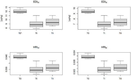 The influence of compost and fly ash was proven statistically because the differences between values of EDIW, EDIM, HRIW, and HRIM calculated for Cu and Zn for T0 and TI as well as T0 and TII differed significantly (Table 3). Simultaneously, the effect of both compost and fly ash on the calculated parameters (EDIW, EDIM, HRIW, and HRIM) for both metals was the same, because the values did not differ statistically. The data in Figure 9 shows the distribution of EDI and HRI values depending on gender of consumers and the additives used. A similar tendency may be observed as shown earlier for camelina, with higher values of these parameters determined for women, whereas at the same time under control conditions they were significantly higher. For women the calculated average EDI value for Cu ranged from 0.40 μg·kg−1 (TI) to 0.49 μg·kg−1 (T0), whereas HRI, regardless of the applied amendments, showed comparable values ranging from 0.010 to 0.012. The EDIW values calculated for TI and TII were 14–18% lower in comparison to these obtained for T0. In the case of men, the average values of both parameters calculated for Cu ranged from 0.32 μg·kg−1 (TI, TII) to 0.39 μg·kg−1 (T0) for EDI and from 0.008 (TI, TII) to 0.009 (T0) for HRI (Figure 9). Referring to the calculated EDI values for Zn, they were significantly higher for both women and men, whereas the HRI values were significantly lower compared to those discussed above for Cu. As it results from the data presented in Figure 10, the highest values of EDIW, EDIM, HRIW, and HRIM calculated for Zn were determined under the control conditions. In turn, for the soil fertilized with compost or fly ash, they were lower. The application of immobilizing agents resulted in a reduction of EDIW and EDIM by 34% and 29%, respectively. For women, average EDI values for Zn ranged from 1.19 μg·kg−1 (TI) to 1.79 μg·kg−1 (T0), whereas for HRI these average values ranged from 0.004 (TI, TII) to 0.006 (T0). For men, the average EDI values for Zn ranged from 0.93 μg·kg−1 (TI) to 1.41 μg·kg−1 (T0), and the average HRI ranged from 0.003 (TI, TII) to 0.005 (T0), respectively (Figure 10).