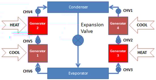 The heat exchange for the beds, the evaporator and the condenser, in addition to valves, shown in Figure 1 is used for the mathematical model.