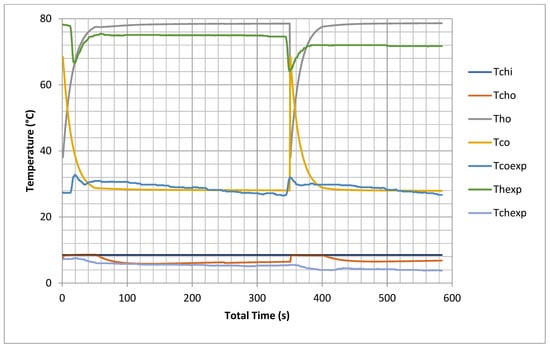 The proposed model predicted temperatures inside the beds, the evaporator and the condenser at one second intervals; thus, the cooling capacity and COP could be evaluated over the cycle and switching time. It is very difficult experimentally to keep constant inlet temperatures for chilled water and cooling and hot water, so the data were measured with varying inlet conditions due to variable solar load use (CSP). In this model, all inlet temperatures were constant, so different outputs were recorded but with same trend as the experimental readings, as shown in Figure 2. The cooling outlet temperature is higher by 5–7 °C than the inlet cooling temperature for both model and experimental results. The chilled water outlet temperature of the model is one degree less than that of the experimental results. This is because the model uses many ideal assumptions as mentioned earlier with regard to the internal heat exchange between heating and cooling water flow during switching from heating to cooling during the experiment.
