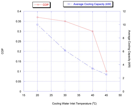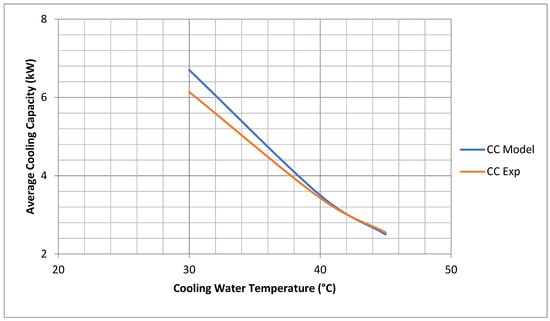 The experimental data for cooling water inlet temperature were time averaged (semi constant) before use in the model. The chiller average cooling capacity coincides very well for both model and experimental results. The average cooling capacity of the model is 110% that of the experimental results at 30 °C and 98% at 45 °C, as shown in Figure 3.