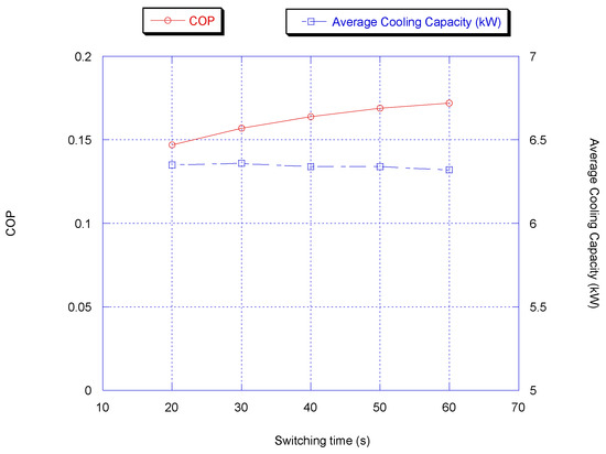 During switching time optimization, the adsorption/desorption and heat recovery times were kept constant at 300 and 50 s, respectively. Figure 5 shows the average cooling capacity and COP. It is very clear that the optimum switching time considering cooling capacity and COP is between 40 and 50 s. The reason is that the beds are fully pre-cooled/pre-heated and further heating/cooling of the beds increases the switching time; thus, the average cooling capacity is reduced since during the switching time, the chiller is not producing a refrigeration effect.