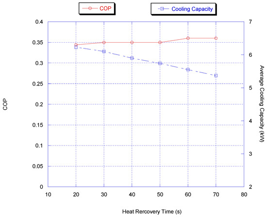 Since the increase in heat recovery time reduced the average cooling capacity and increased the COP, a compromise of 30 s for heat recovery time was chosen.