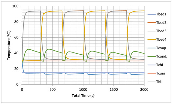 The prediction of temporal histories for the four beds, in addition to the evaporator and the condenser, using models is shown in Figure 7. The temperature profiles are simulated at nominal operating conditions as shown in Appendix C.