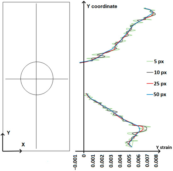 While the full field displacement can be directly calculated based on comparing subsets in images taken from deformed and undeformed object surface, the full field strain evaluation requires additional post-processing of the discrete displacement data points, namely numerical differentiation, which is based on interpolation functions of the discrete displacement field applied over subset areas of the entirely full field area, which subsets are defined according to an user-specified size and step periodicity. Numerical differentiation in mathematical theory is considered as an “unstable and risky operation” [9]. First of all, differentiation-based methods face with deficiencies for problems involving discrete/discontinuous fields. Further, finite difference approaches are sensitive to noise. Pan et al. [10] demonstrated that if the measurement error of displacements is ±0.02 px and the DIC grid step is 5 pixels, then the error of strain calculation by forward difference is 8000 µε. An error of this magnitude will hide the underlying strain information and the strain result will be worthless in most cases. The problem of strain measurement for a plate with circular hole under tension from the 2D DIC challenge 1.0 Sample 12 [11] was analyzed by several authors [12,13,14] (Figure 1). The exact strain solution for this problem is not given and can be only predicted by comparing with FE simulation or other numerical/experimental methods.