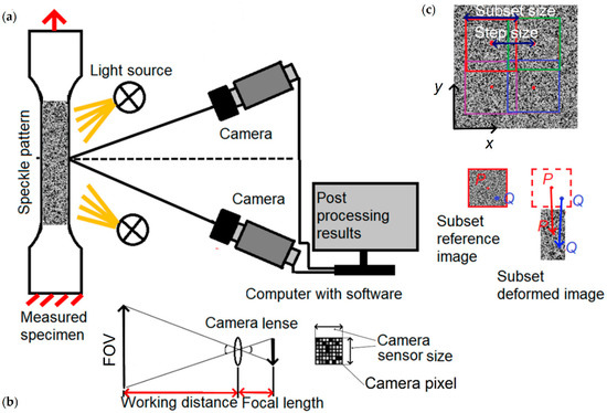 Then, displacements of the speckle pattern points subsets are tracked with the optical cameras and recorded during the specimen deformation. Camera selection is based on the proper magnification which depends on the measuring scale of the test specimen. The specimens measuring area (FOV), camera sensor size, and the focal length of the lenses used with the camera are necessary to determine the magnification and working distance of the camera and thus its applicability for particular objects measurements [38]. Some of these parameters are shown in Figure 2b. Perfect camera focus and specimen lighting are required and can be achieved by adjusting the camera and light source to have enough exposure of the specimen (while avoiding over exposure). Some noise caused by the camera sensor, electronics, and lighting fluctuations is unavoidable, but its effect on measurement results can be minimized by a properly selected DIC setup [39].