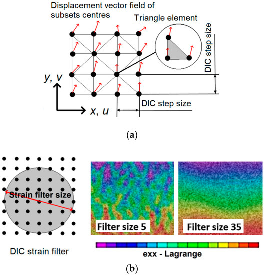 Because the edge length of each triangle is about several pixels, strain results without additional smoothing techniques would be noisy. Because of this, DIC strain filters which smoothen the strain results over the strain filter area (Figure 3b) are applied. The filter size is a user defined parameter which can be expressed by the number of the DIC step sizes (e.g., filter 5–5 steps sizes, filter 35–35 step sizes, etc.). The DIC user should select between the high noise when using a small size strain filter vs low accuracy when using large strain filter (Figure 3b).