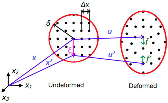 The peridynamics (PD) theory [26,43] reformulates the classical continuum mechanics theory by including spatial integrals instead of spatial derivatives in its equations of motion. Owing to this feature, the PD model enables the possibility to effectively simulate discontinuities (e.g., cracks, defects) without the need of any additional models. In the PD model the domain is discretized into a square grid of equally spaced material points (PD grid spacing Δx, see Figure 4) and each material point x, defined by the position vector x, interacts with the material points x′ in the interaction range Hx called PD horizon, which is a measure of the material non-local behavior defining the range of interaction of the material points. The horizon size δ is, usually expressed as a radius equal to a multiple of the PD grid spacing δ = mΔx (Figure 4). According to studies on the parameter m [44], a PD horizon of about 3·Δx ensures the PD model stability and convergence in most cases. The PD model grid size Δx should be selected to evaluate the local effects with suitable accuracy, and can be found based on results of convergence analysis. The interaction between the PD points x and x′ is called PD bond, and the deformation of the body (displacement vectors u and u′ of points x and x′) causes deformation of the PD bonds and thus forces f and f′ acting on the PD bonds between the points x and x′.