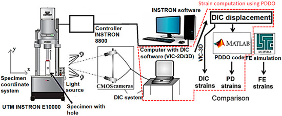 The (experimental) strain computation setup is shown in Figure 5. Strain computation stage using PDDO (only this stage was necessary for the strain computation from DIC displacements calculated from DIC Challenge [11] images) is excluded with dashed line in Figure 5. In order to perform a tensile test for experimental DIC measurements, an electromechanical testing machine INSTRON E10000 with maximum force 10 kN was used, and the specimen with hole was loaded in tension at 3 mm/min crosshead speed. The full field displacement and strain measurements were done with the 3D DIC system from Correlated Solutions [2] equipped with two CMOS cameras Basler acA4112 of 12 Mpx resolution, sensor size 14.1 mm × 10.3 mm, pixel size 3.45 µm × 3.45 µm, and lenses of focal length 25 mm. Adjustable power LED lamp ProfiluxLED1000 with maximum power 185 W was used as light source. A black dots speckle pattern of 0.18 mm size was painted on the specimen surface, previously coated with white paint, using a painting roller from Correlated Solutions. A total of 25 calibration images of a 14 × 10 dots calibration plate with 10 mm dots spacing were taken before the experiment to calibrate the DIC system.