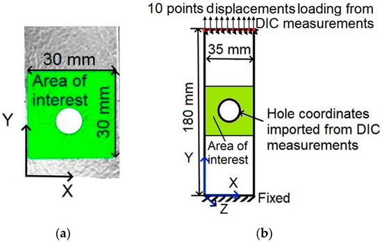 Computation scheme: (a) selected area of interest on the specimen surface for the DIC-PPDO calculation; (b) loading scheme of the specimen FE model.