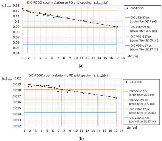 Plots of the absolute maximum values of the and Lagrangian strains computed on in-house tensile experiment specimen surface by applying the DIC-PDDO method, as function of the PD grid spacing when the PD horizon size is fixed to , are presented in Figure 7. Each dot in Figure 7 represents the DIC-PPDO maximum absolute strain value at selected PD grid spacing , while the strain-PD grid spacing relation approximation with linear function is shown with dashed line. The same strain values calculated by the DIC algorithm for different setup values of the DIC VSG, are also plotted in Figure 7. The PD grid spacing , as parameter independent on the particular specimen dimensions, is expressed as number of specimen pixels (calculated according to the Equation (5)).