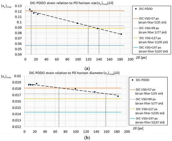 The effect of the PD horizon diameter 2δ (measured in pixels) on the PDDO-calculated strain values, and comparison against the values calculated for different VSG sizes is shown in Figure 8 for the PD grid spacing px. The same way as in Figure 7, the dots in Figure 8 represent the DIC-PPDO maximum absolute strain value at different PD horizon diameters while the linear strain-PD horizon diameter relationship is shown with dashed line. Although the same PD horizon size can be achieved by taking different PD grid spacings and multipliers m, our study shows that the maximum absolute strain value correlated well to the PD horizon size independently of the PD grid spacing selected to achieve a particular value of the PD horizon in Figure 8.