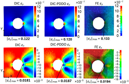 In order to validate the DIC and DIC-PDDO results, comparison of the DIC and DIC-PDDO strains against the FE simulation strains computed on in-house tensile experiment specimen surface is presented in Figure 9, showing a good agreement in terms of magnitude and location of maximum strains, as well as distribution and magnitude of the overall strain fields. Based on the results from Figure 7 and Figure 8, VSG of size 57 px was used for DIC and the PD absolute horizon diameter of 24 px (1.04 mm) was selected for DIC-PDDO. A difference of 8% for both and strains is obtained between the DIC-PDDO and the FE results. It is also worth noticing the asymmetric profile of the strain field in Figure 9 (which is due to imperfect circular profile of the central hole and imperfect alignment between specimen and loading in the testing machine; the method, used to evaluate and reduce those effects, is defined in Section 3.3) shows bigger differences between DIC and FE strains than the differences between DIC and DIC-PDDO strains. Moreover, DIC smears the maximum strain value near the hole and thus FE simulation results higher maximum strains. Nevertheless, strain fields, captured by the experimental DIC measurement can be validated by the FEA computational results and are well reproduced by the DIC-PDDO method in terms of both distribution and magnitude.
