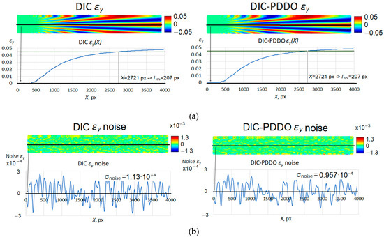 DIC and DIC-PDDO strain computation methods comparison using MEI: (a) strain fields showing the same spatial resolution of both methods for the DIC VSG = 81 px and PD 140 px, (b) measurement resolution showing 1.2 times lower noise standard deviation in DIC-PDDO strains.
