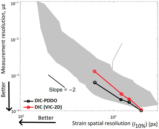 For the same spatial resolution expressed by the 10% cutoff period of 207 px, standard deviations of computed strain noise levels are 1.13 × 10−4 for DIC and 0.957·10−4 for DIC-PDDO methods resulting in 1.4 lower MEI value for the DIC-PDDO strain computation method (2.65 µε2·px for DIC and 1.98 µε2·px for DIC-PDDO respectively). Figure 10 and Figure 11 present the DIC-PDDO method comparison against conventional DIC strain calculation algorithms. MEI-based DIC algorithms review was graphically presented in [35] where each DIC algorithm spatial resolution (x-axis) vs measurement resolution (y-axis) is plotted. Plot in Figure 11 replicates the plot from [35] by extending it with the same DIC-PDDO metrics while DIC algorithms data points from [35] are generalized and shown as grey area in the plot.