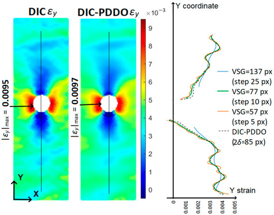 Moreover, the results from the DIC-PDDO and DIC converge when using the minimum setup values for the PD grid spacing and DIC VSG showing thus the potential of the PDDO to capture localized strain values (situation in which the DIC results are highly prone to noise/oscillations [12,13,14], also see Figure 1). Relative differences of 1.6% for the and 2.6% for the strain components are obtained between the PDDO and DIC calculations, for the minimum setup value of 1 px for the PD grid spacing and VSG = 57 px for the DIC VSG.