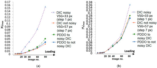 The data in Figure 12 represent a snapshot during the specimens deformation, corresponding to 75% of the failure load (DIC image no. 60 in the set of DIC images recorded during deformation). In order to analyze the proposed PDDO method at different levels of deformation, strains were also analyzed at different loading levels of the specimen, from the test start to the specimens failure (DIC image no. 80), and results are plotted in Figure 14. The plots in Figure 14 show increasing absolute differences between the curves with the deformation due to selected artificial noise generation method and the PDDO method is able to eliminate the effects of the input noise at various deformation levels.